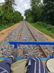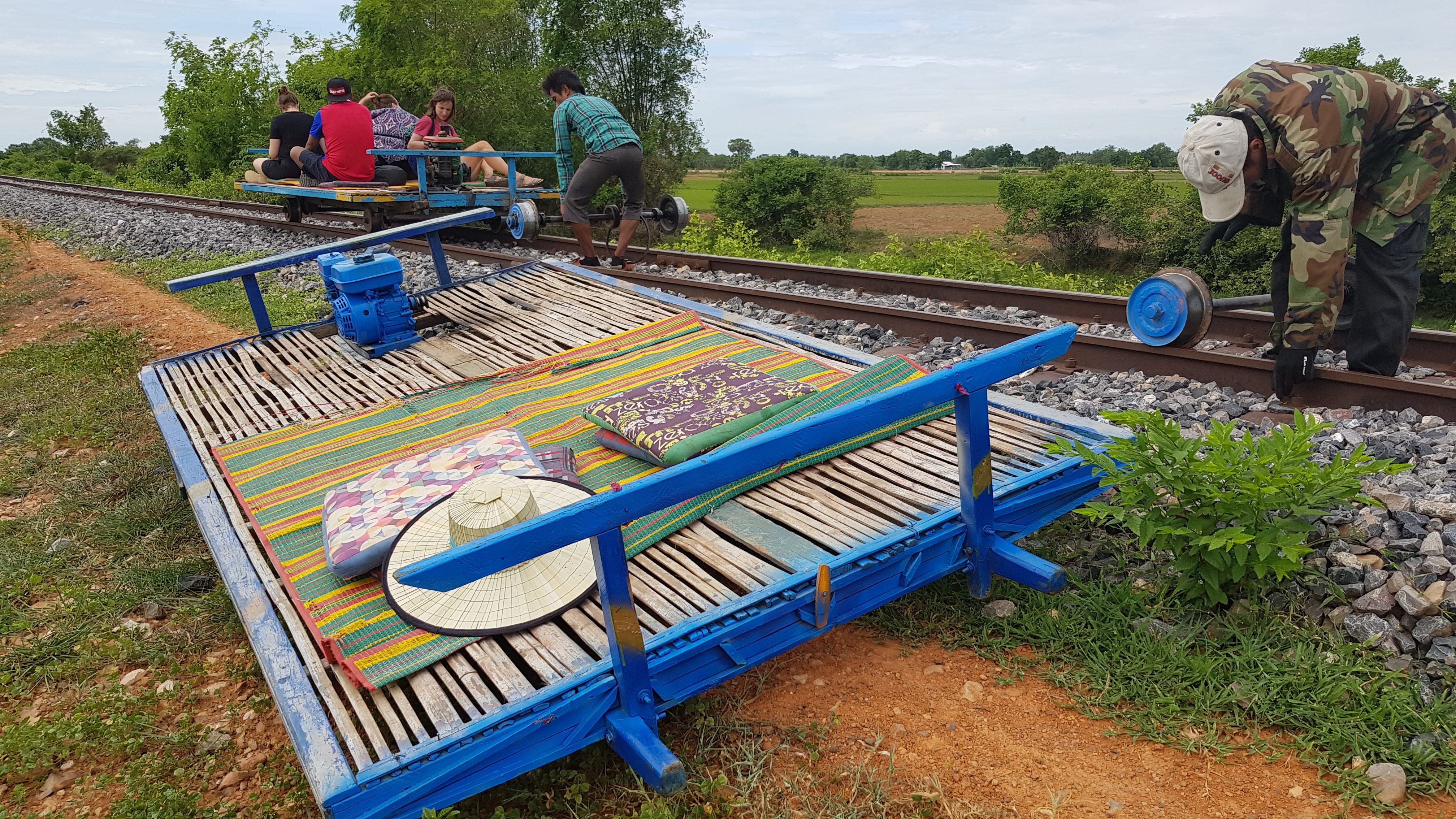 De zelfde man die ons gisteren mee nam naar de killing cave en de batcave nam ons vandaag in zijn tuk tuk mee naar de oude bamboe trein. En oud spoor liep door rijstvelden naar een plaats waar wat kraampjes waren speciaal voor de bamboe trein. Het treintje dat bestond uit een plank van bamboe, twee losse sets wielen en een motor werd op de rails geplaatst en we mochten plaats nemen. Daar gingen we.
