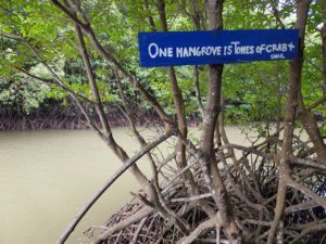 De mangrove die we bezochten konden we alleen bereiken per boot. De plek waar we opstapten was erg kleurrijk en het was duidelijk dat het om een organisatie ging die ervoor zorgt dat er steeds meer bomen bij komen. Het volle bos waar we liepen op planken tussen de bomen die uit het water groeide werd steeds minder dik begroeid. De bomen werden steeds jonger naarmate we dichterbij het open water kwamen. Daar zagen we hoe net geplante boompjes maar een klein stukje boven het water uitkwamen en nog verderop zelfs niet meer. De jongste plantjes kon je alleen zien als het eb was. We gingen weer aan boord van de vissersboot en zo gingen we terug naar de tuk tuk.