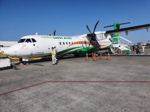 Vandaag vliegen wij met Uni Air van Kaohsiung International Airport naar Penghu Airport. Uni Air is een nationale dochteronderneming van EVA Air. De vlucht duurt maar 40 minuten. Toch krijg je nog iets te drinken een kleine snack. Omdat je in 40 minuten niet heel erg hoog komt heb je vanuit het vliegtuig een prachtig uitzicht over Taiwan.